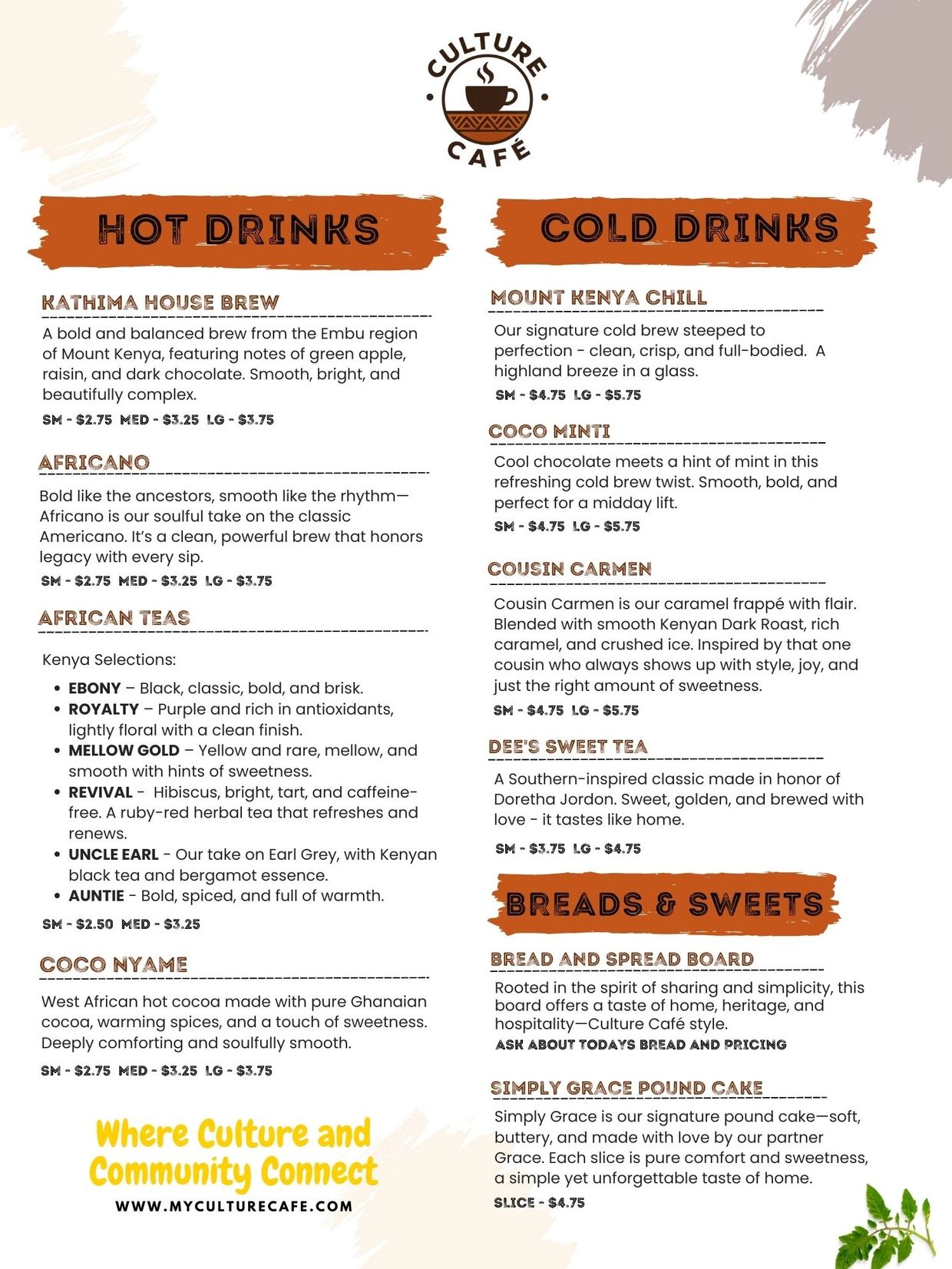 At Culture Cafe, our mission is to deliver exceptional, culturally inspired coffee and tea experiences while fostering a welcoming space that encourages storytelling, connection, and community growth.